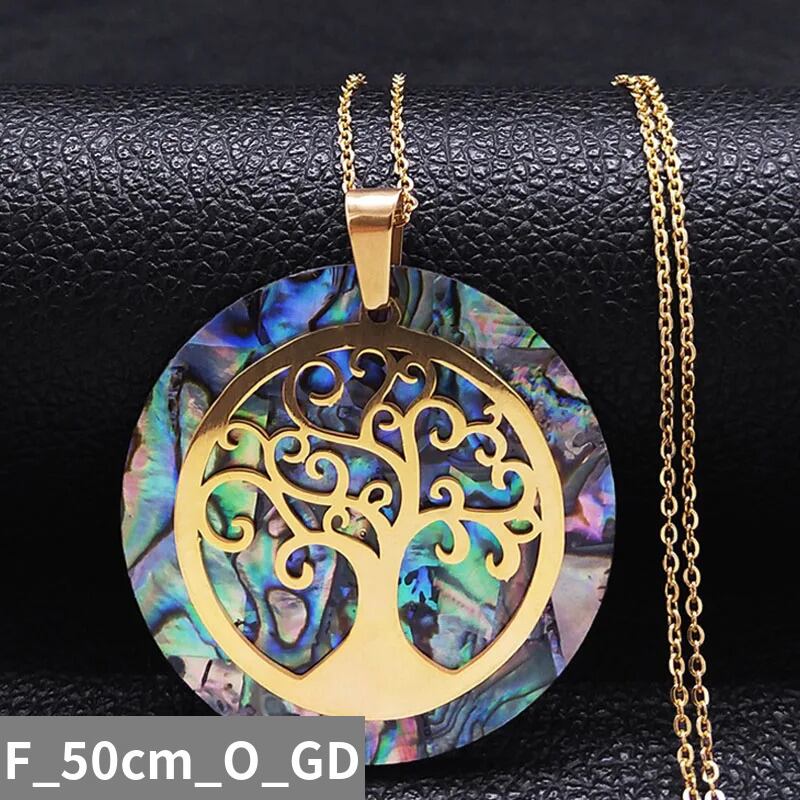 木 ツリー 木の葉 リーフ 植物 プラント ライフ ステンレススチール アワビ 動物 アニマル シェル 貝殻 ナチュラル ネックレス チェーン ゴールド カラー マザー パール BOHO ジュエリー NX