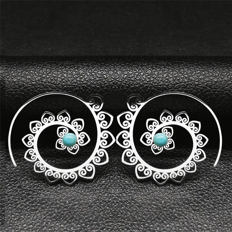ビンテージ エスニック インド 刻印 マンダラ 花 フラワー ダングル 揺れる ピアス ステンレス スチール ストーン BOHO 透かし ジュエリー ペンダント