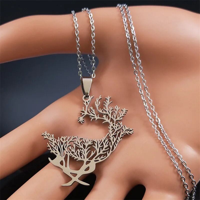 エルク 鹿 ディアー 動物 アニマル 木 ツリー 木の葉 リーフ 植物 プラント ライフ ペンダント ネックレス レディース シルバー カラー 透かし ステンレス スチール ブランチ ジュエリー ギフト N2016S