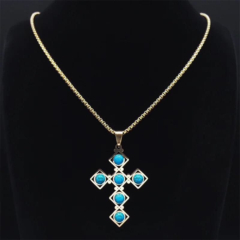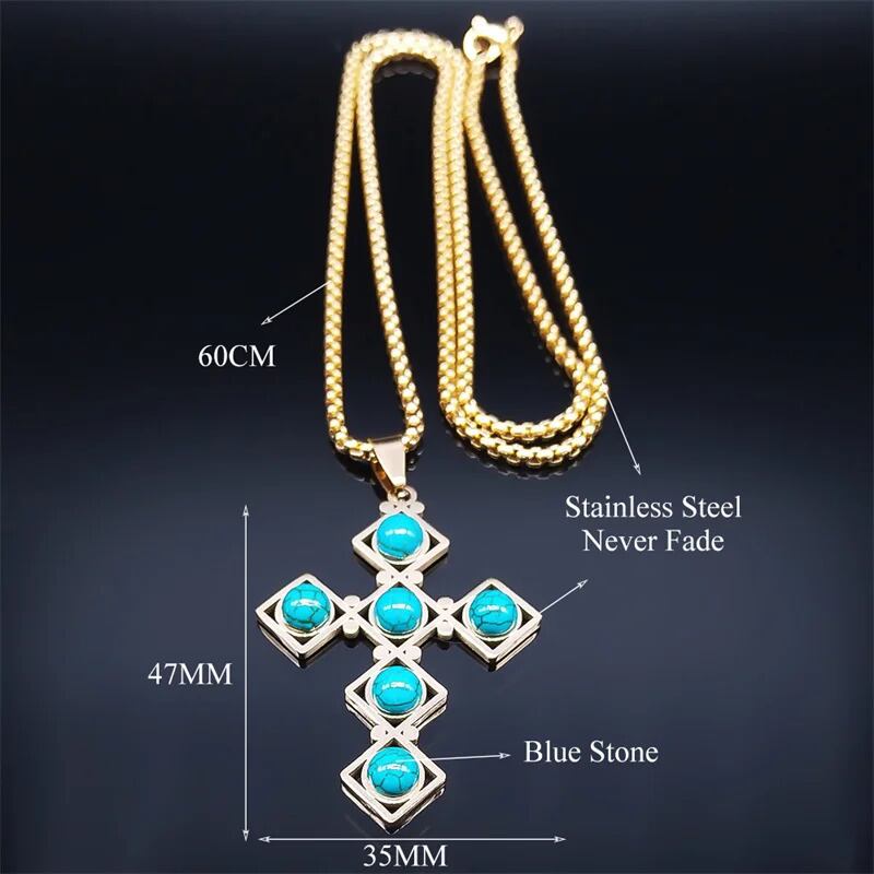 BOHO ステンレス スチール 青 ブルー ストーン ネックレス レディース メンズ クロス ペンダント セーター チェーン ロング ジュエリー レイキ ヒーリング ギフト