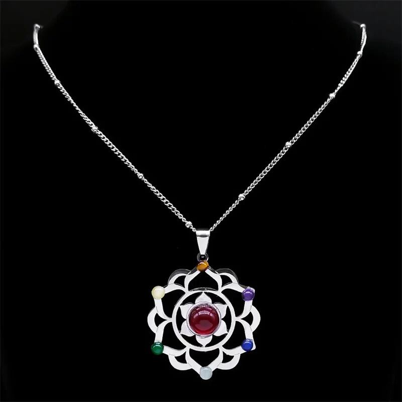 7 チャクラ 神聖 ジオメトリ メタトロン ネックレス レディース 花 フラワー  ライフ ステンレス スチール ストーン レイキ ヒーリング ジュエリー N