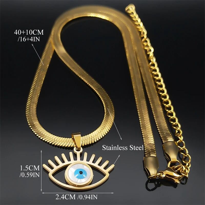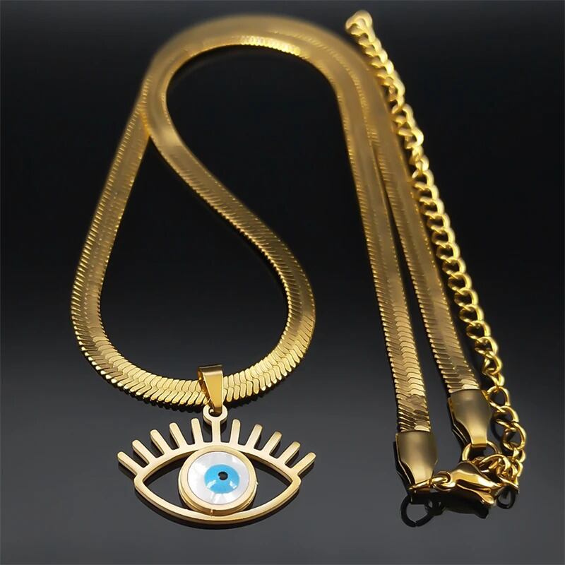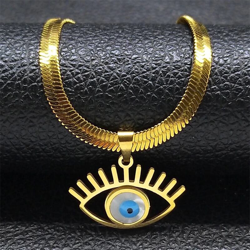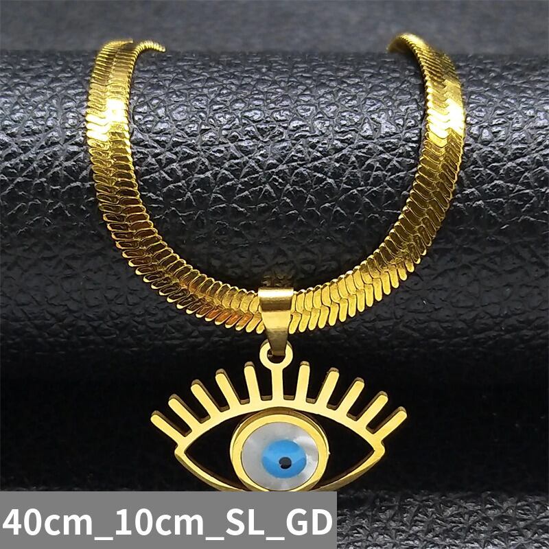 ビンテージ シェル 貝殻 悪 エビル 青 ブルー 目 アイズ チョーカー ネックレス レディース ステンレス スチール ゴールド カラー 蛇 スネイク ヘビ 動物 アニマル チェーン 悪魔 デーモン ジュエリー N3207S