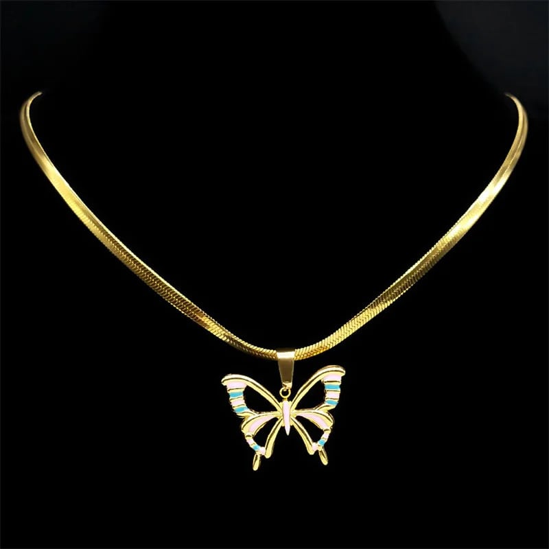 蝶 バタフライ 昆虫 インセクト 透かし エナメル ペンダント ネックレス レディース ステンレス スチール ゴールド カラー ビンテージ チョーカー ジュエリー ギフト N