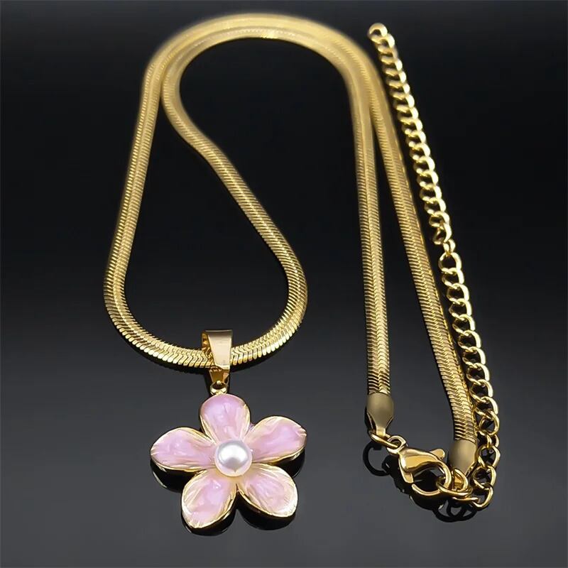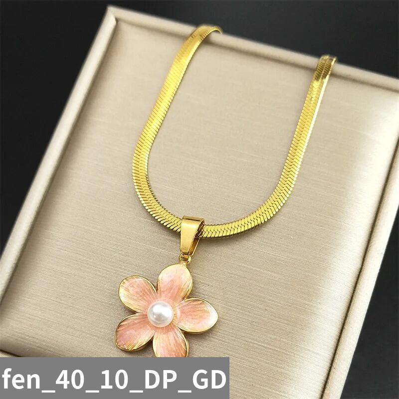韓国 ファッション ピンク さくら エナメル 花 フラワー パール ネックレス チョーカー レディース ステンレス スチール ゴールド カラー ジュエリー N407S