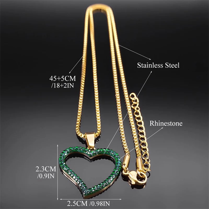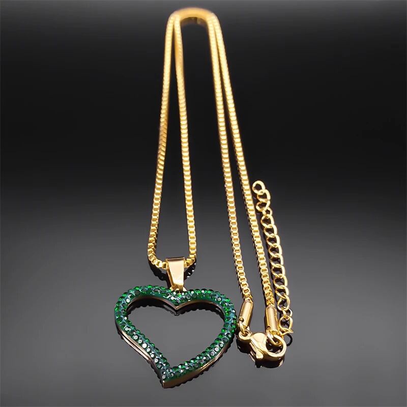 ユニーク 緑 グリーン 透かし クリスタル ハート ペンダント ネックレス レディース ステンレス スチール ゴールド プレート パーティ アクセサリー ジュエリー ギフト N