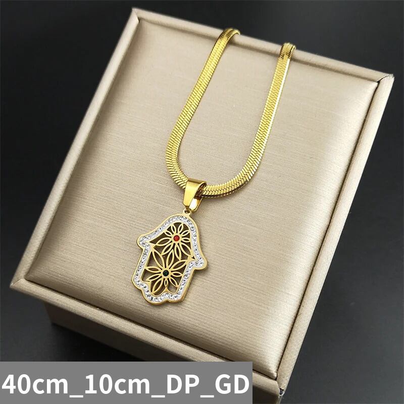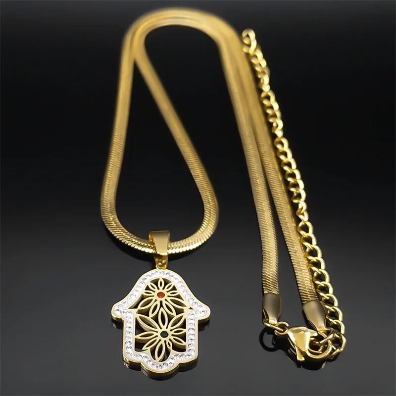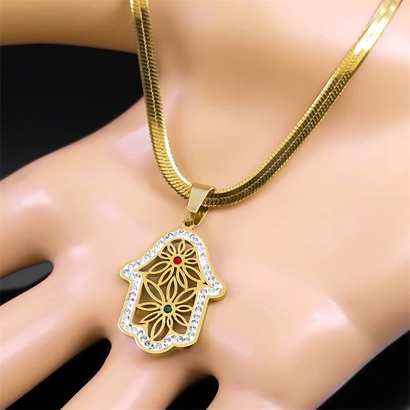 花 フラワー ハムサ ハンド ネックレス ビンテージ レディース ステンレス スチール ラインストーン 鎖骨 チェーン ジュエリー ギフト N
