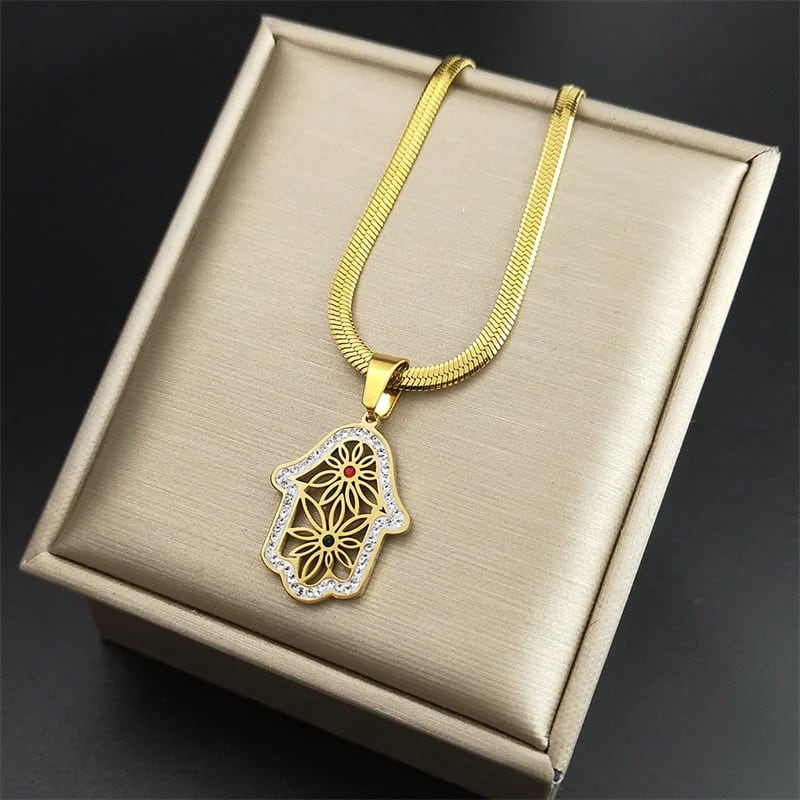 ネックレス ラインストーン 花 フラワー ステンレス ビンテージ チェーン ハムサ レディース ハンド