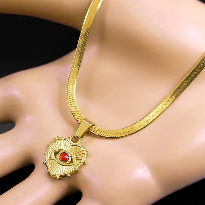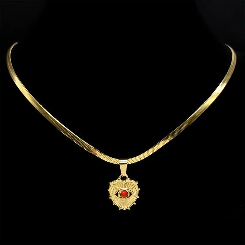 ビンテージ 赤 レッド ストーン デビル 目 アイズ ハート ペンダント ネックレス  レディース メンズ ステンレス スチール ゴールド カラー チャーム ジュエリー パート ギフト
