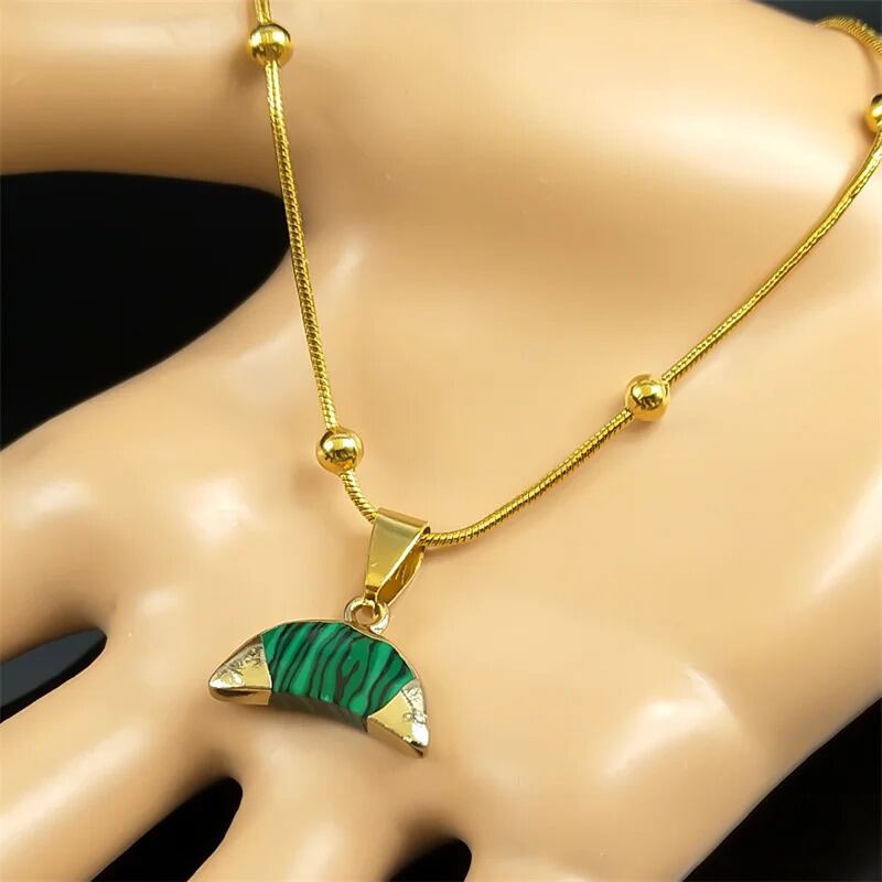 ビンテージ 緑 グリーン マラカイト ストーン 反転 三日月 月 ムーン ペンダント ネックレス レディース メンズ ステンレス スチール ゴールド カラー ビーズ チェーン ジュエリー