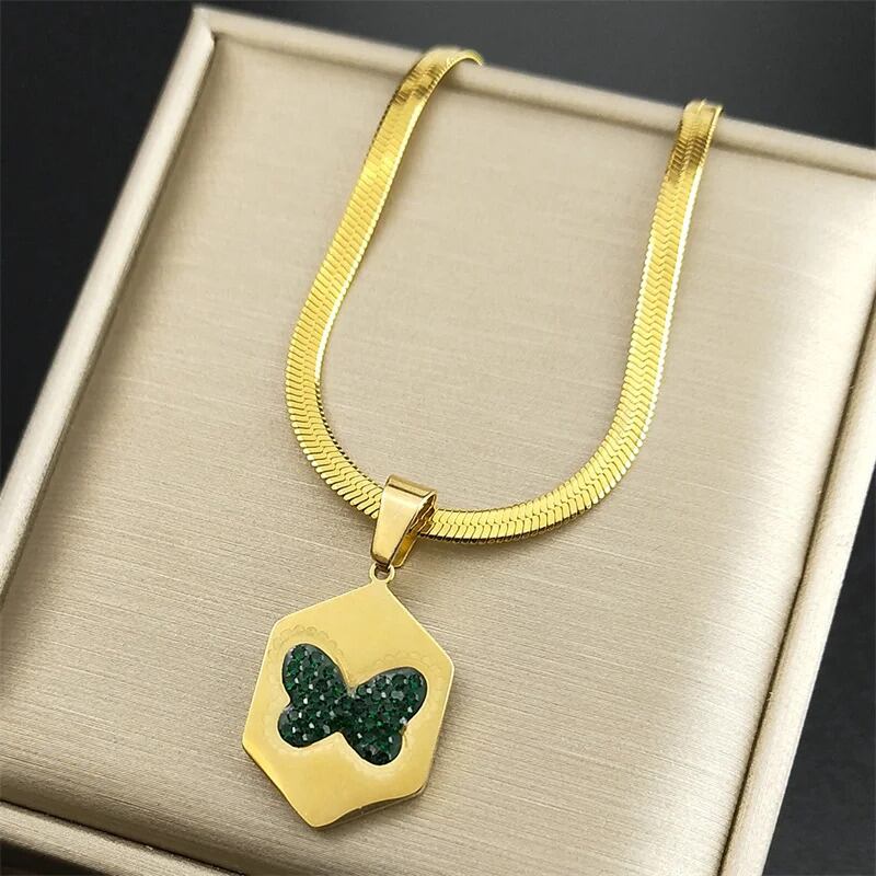 六角形 緑 グリーン ラインストーン 蝶 バタフライ 昆虫 インセクト ペンダント ネックレス レディース ステンレス スチール ゴールド カラー 刃 ブレード チェーン ビンテージ 幾何学 ジュエリー