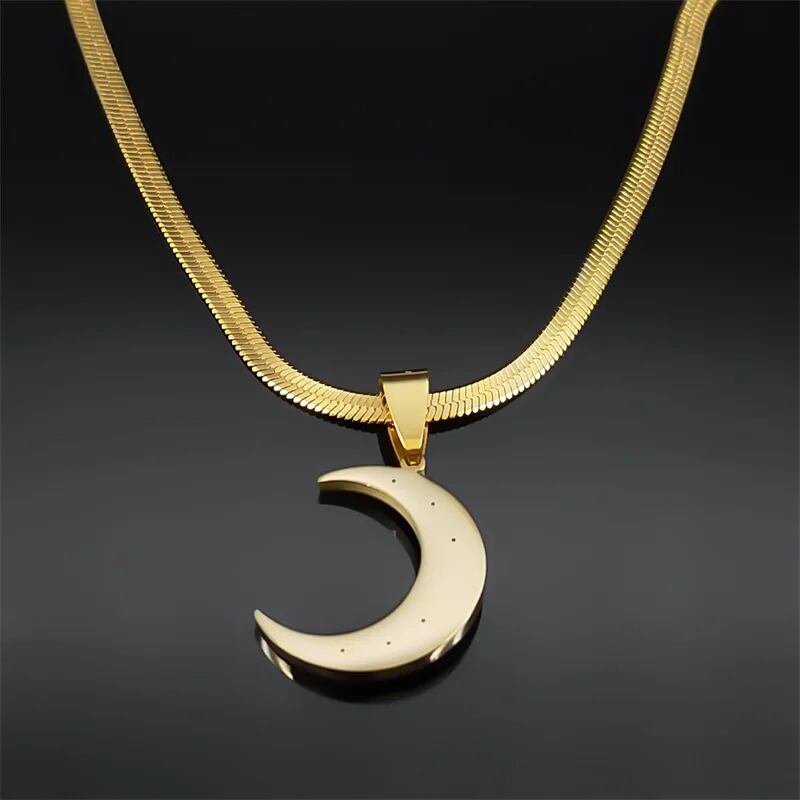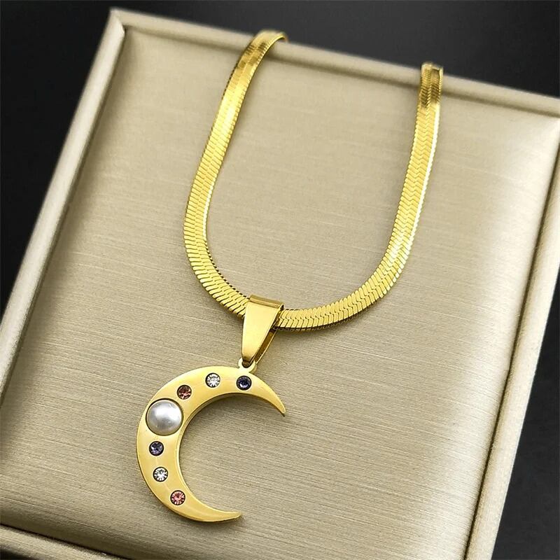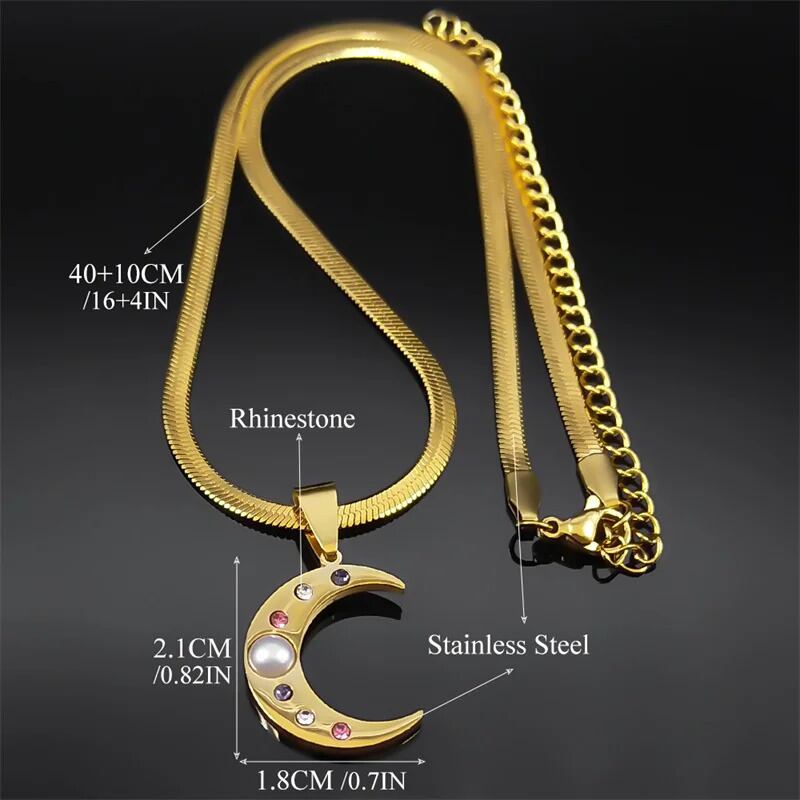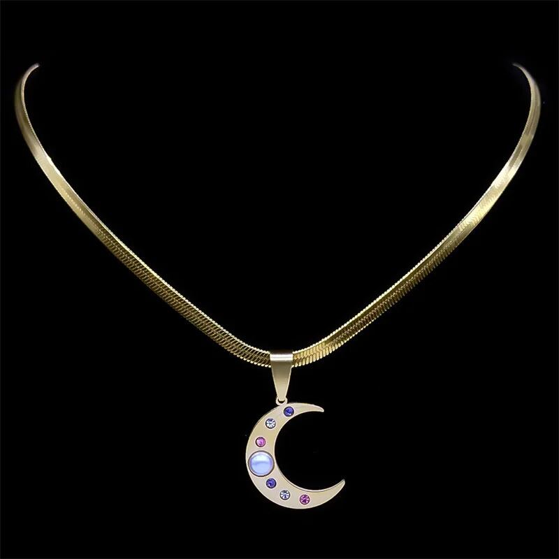 カラフル ラインストーン 三日月 月 ムーン ペンダント ネックレス レディース ステンレス スチール ゴールド カラー 刃 ブレード チェーン 結婚式 ウェディング パーティ ジュエリー ギフト