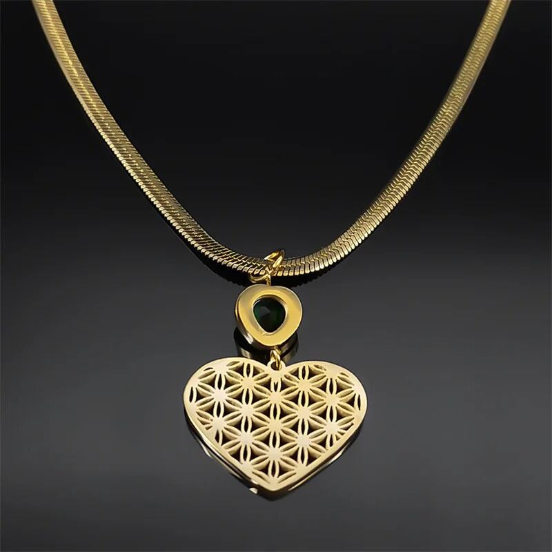 ネックレスジュエリー:フラワーオブライフラブハートグリーンラインストーンペンダントネックレスレディースステンレススチールゴールドカラーチョーカーブレードチェーンパーティージュエリー