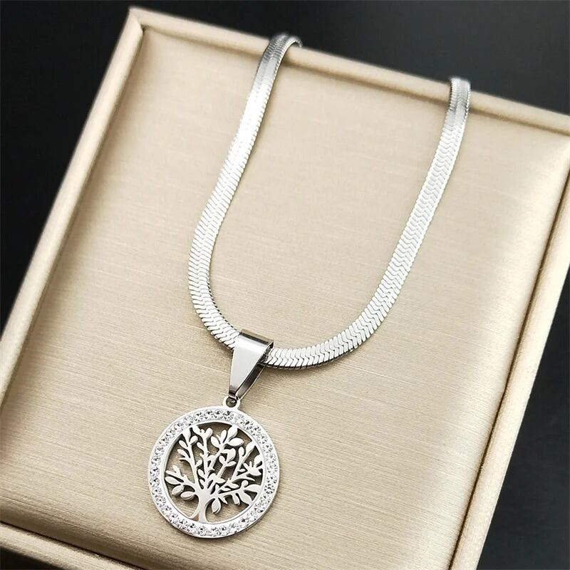 木 ツリー 木の葉 リーフ 植物 プラント ライフ ステンレス スチール ペンダント ネックレス レディース メンズ ラインストーン シルバー カラー ステートメント ジュエリー N