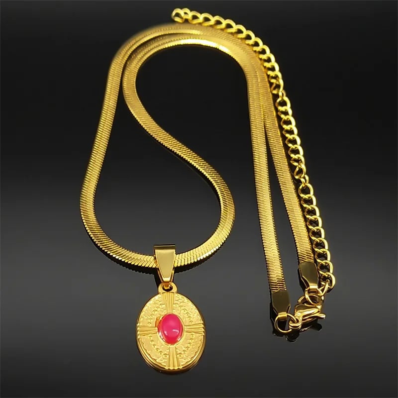 ナチュラル ストーン オバール クロス ペンダント ネックレス レディース メンズ ステンレス スチール ゴールド カラー ビンテージ イエス チョーカー チェーン パーティ ジュエリー