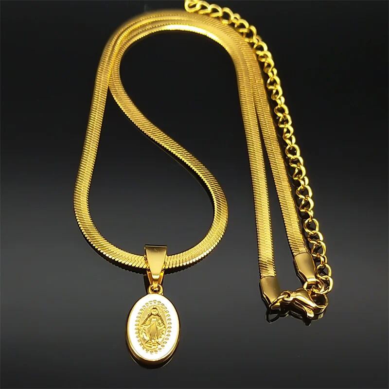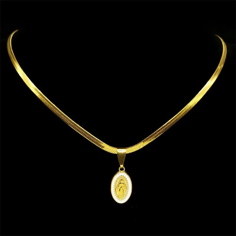 バージン メアリー エナメル ステンレス スチール ペンダント ネックレス レディース メンズ ゴールド カラー チョーカー チェーン ビンテージ パーティ キリスト お守り ジュエリー