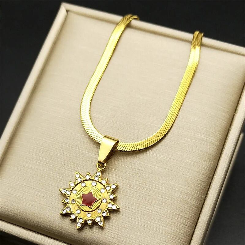 クラシック 白 ホワイト ラインストーン 赤 レッド 五芒星 スター 太陽 ペンダント ネックレス レディース メンズ ステンレス スチール ゴールド カラー 星 チョーカー チェーン パーティ ジュエリー