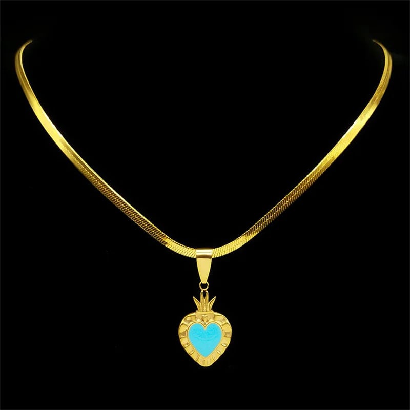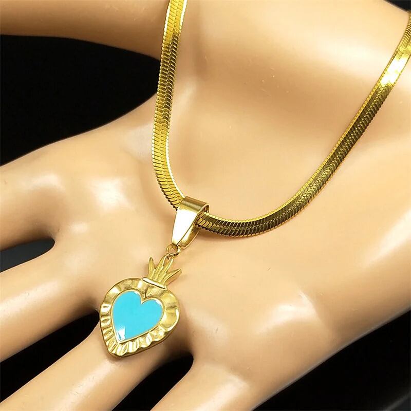 ファッション 青 ブルー エナメル Love ハート ペンダント ネックレス ロマンチック レディース チェーン ステンレス スチール チョーカー トレンド クラウン ジュエリー ギフト