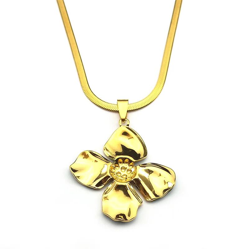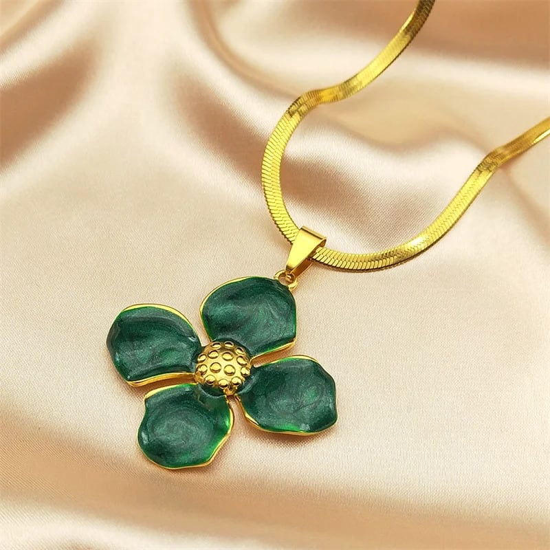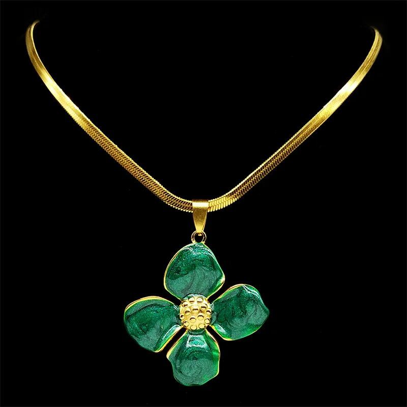 ファッション 大 花 フラワー 緑 グリーン エナメル ペンダント ネックレス チョーカー レディース ステンレス スチール ゴールド カラー 花びら おしべ ジュエリー ギフト