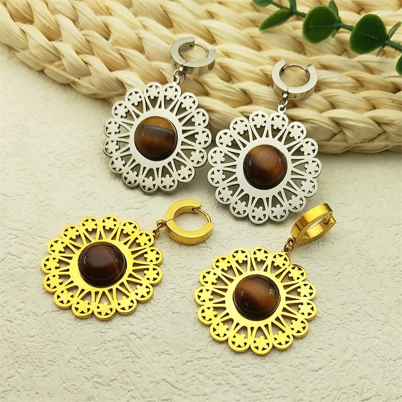 ファイン ファッション:タイガーアイストーンヴィンテージフラワードロップピアス