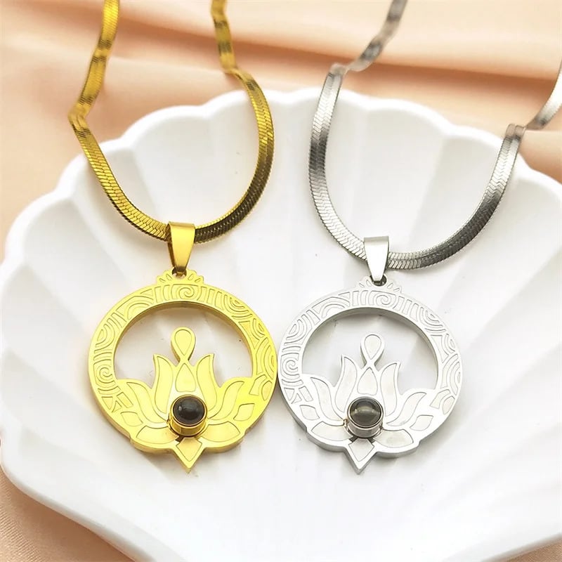 ロータス すいれん はす スイレン ハス 蓮 植物 プラント 花 フラワー ブッダ 仏 仏教 6 ワード マントラ プロジェクション ペンダント ネックレス メンズ レディース ステンレス スチール ゴールド カラー 刃 ブレード チェーン 仏教徒 ジュエリー