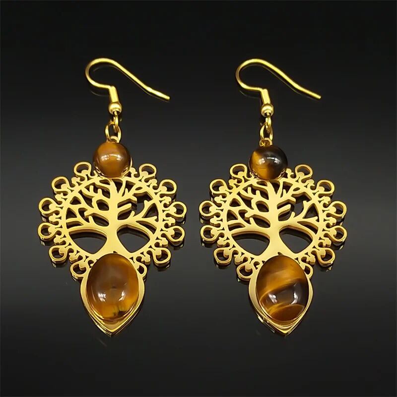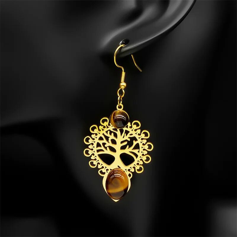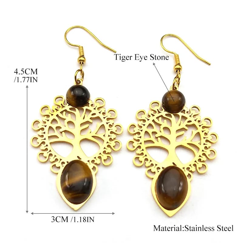 ファイン ファッション:タイガーアイストーンボヘミアンツリーオブライフドロップピアス