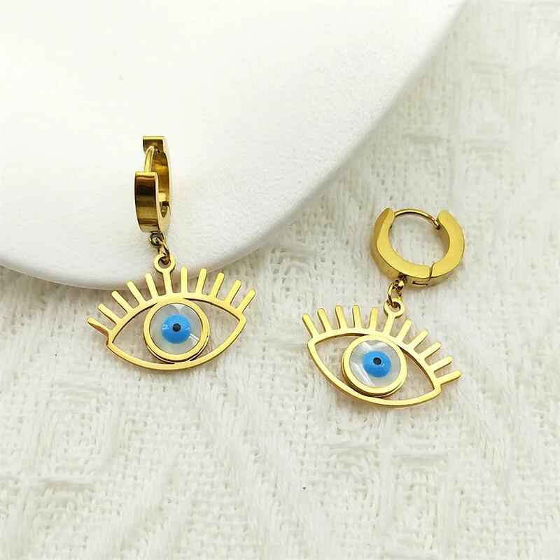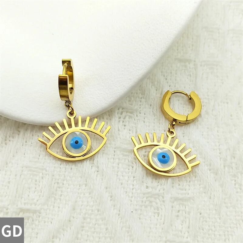 ビンテージ シェル 貝殻 悪 エビル 青 ブルー 目 アイズ ダングル 揺れる ピアス レディース ステンレス スチール ゴールド カラー 悪魔 デーモン ドロップ ジュエリー