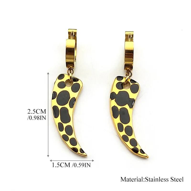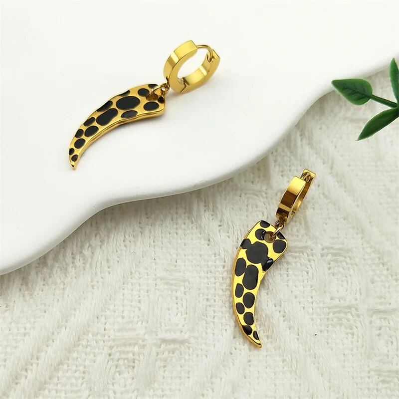 ビンテージ ステンレス スチール 牛 ホーン 黒 ブラック エナメル ダングル 揺れる ピアス レディース メンズ ヒョウ レオパード 豹 動物 アニマル 印刷 プリント ドロップ パーティ ジュエリー