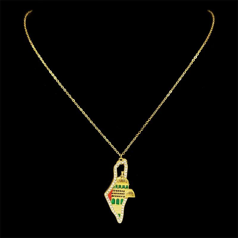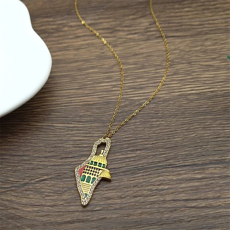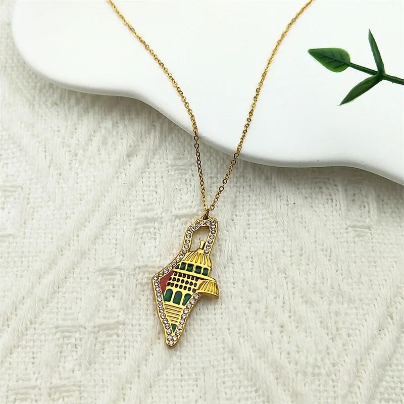 イスラエル 地図 マップ ユダヤ 城 カラフル エナメル ラインストーン ペンダント ネックレス レディース ステンレス スチール ゴールド カラー イスラム ジュエリー