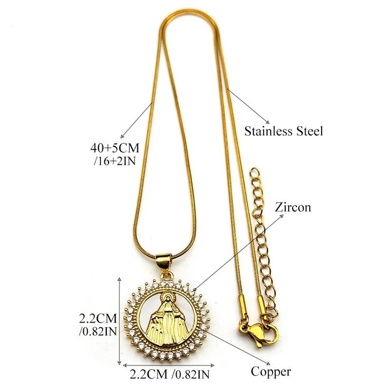 ステンレス スチール バージン メアリー ラウンド ステートメント ラインストーン ペンダント ネックレス レディース ゴールド カラー ジオメトリ チェーン ジュエリー