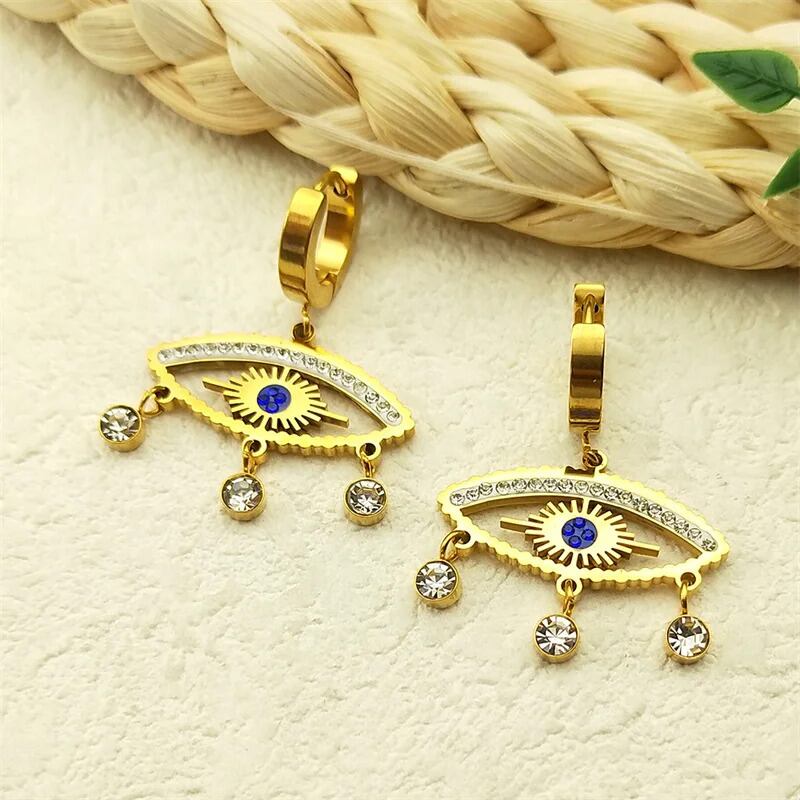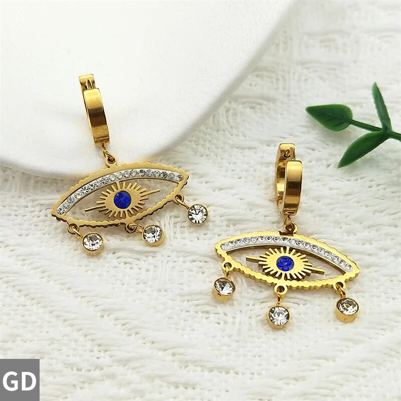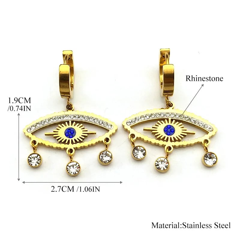 ビンテージ ラインストーン 悪 エビル 青 ブルー 目 アイズ フープ ピアス レディース ステンレス スチール ゴールド カラー 悪魔 デーモン ダングル 揺れる ジュエリー