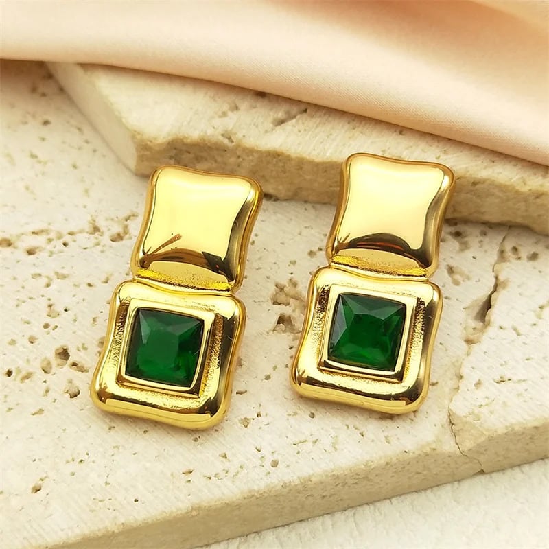 チャーム 緑 グリーン ガラス 四角 スクエア ピアス レディース ガール ステンレス スチール ゴールド カラー パーティ 耳 イヤー スタッド ジュエリー ギフト