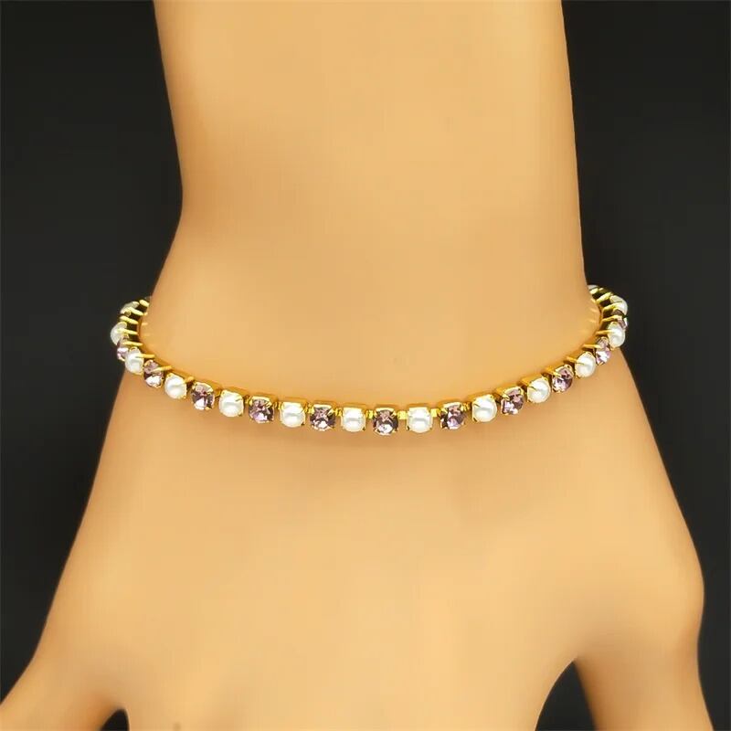 透明 ピンク ラインストーン ブレスレット レディース ガール 白 ホワイト パール ステンレス スチール ゴールド カラー パーティ ハンド チェーン ジュエリー ギフト