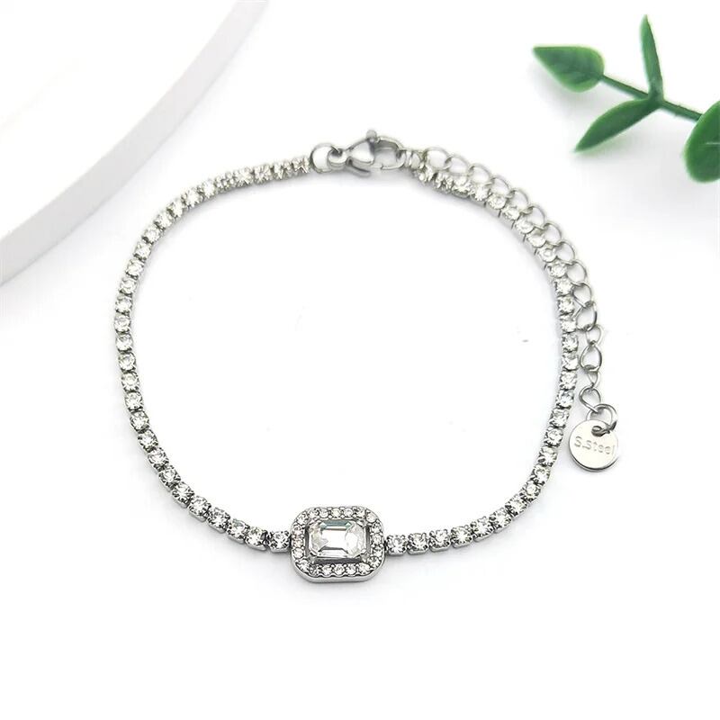透明 四角 スクエア ラインストーン ブレスレット レディース ガール ステンレス スチール シルバー カラー ジオメトリ パーティ ハンド チェーン ジュエリー ギフト