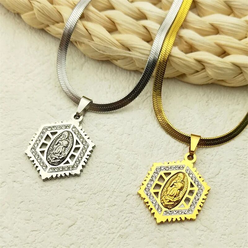 バージン メアリー 六角形 ヘキサゴン ラインストーン ペンダント ネックレス レディース メンズ ステンレス スチール ゴールド シルバー カラー 宗教 レリジョン お守り チェーン ジュエリー