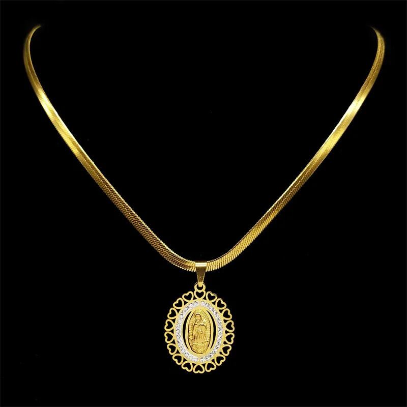 バージン メアリー Love ハート ラインストーン ネックレス レディース メンズ ステンレス スチール ゴールド カラー 宗教 レリジョン お守り チェーン ジュエリー ギフト