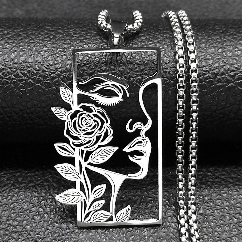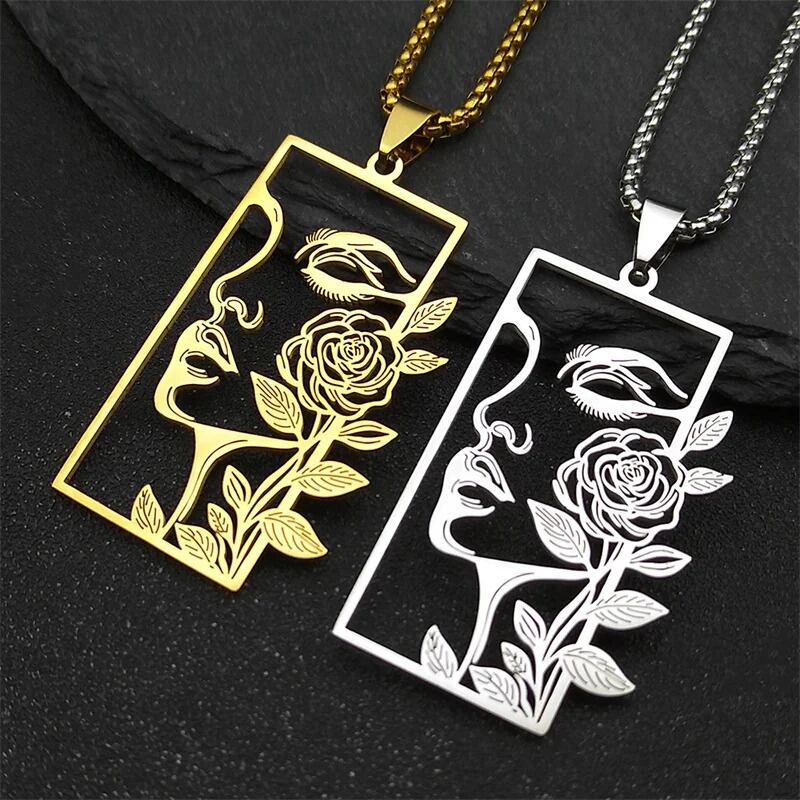 透かし ポートレイト ローズ 花 フラワー ペンダント ネックレス メンズ レディース ステンレス スチール ゴールド シルバー カラー チェーン 幾何学 ジュエリー ギフト