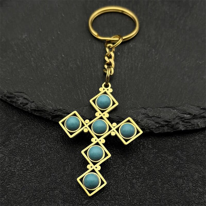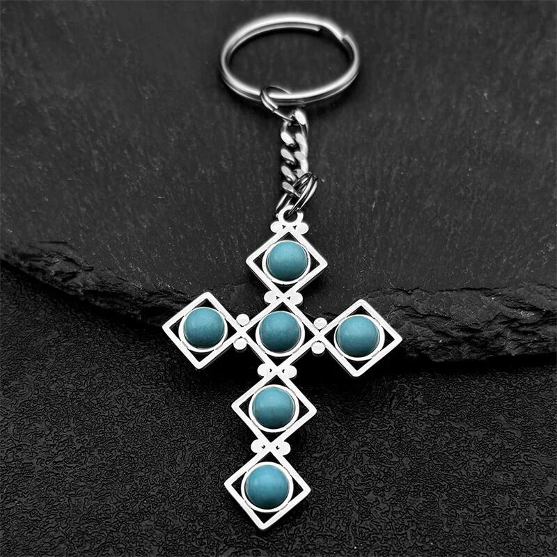 BOHO ステンレス スチール ターコイズ ストーン 鍵 キー チェーン レディース メンズ クロス ペンダント リング 指輪 カトリック お守り ジュエリー レイキ ヒーリング ギフト