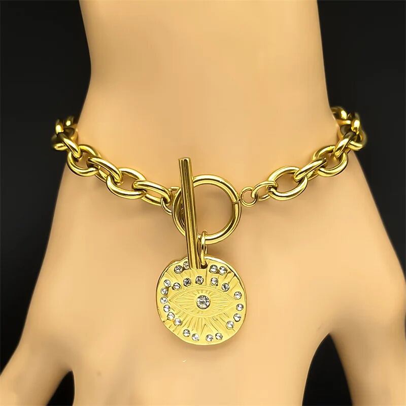 クリスタル 悪 エビル 目 アイズ メダル ブレスレット レディース メンズ ステンレス スチール ラインストーン ゴールド シルバー カラー 悪魔 デーモン バングル ジュエリー ギフト