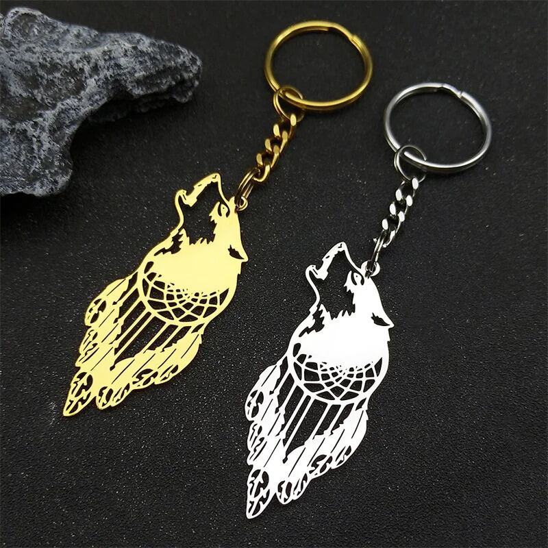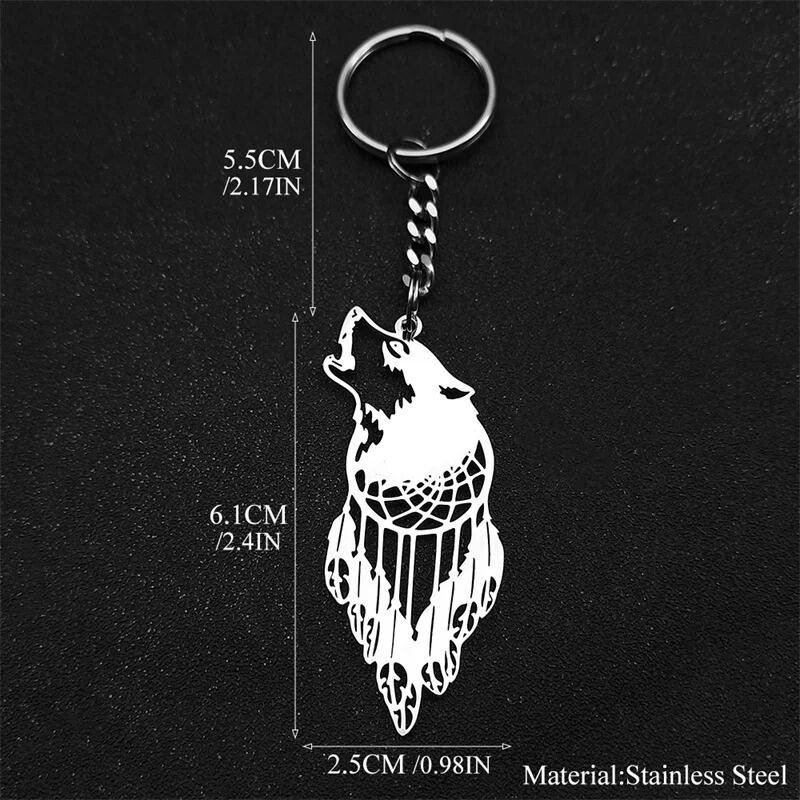 ファイン ファッション: ボヘミアステンレススチールバイキングウルフヘッドドリームキャッチャーキーチェーン