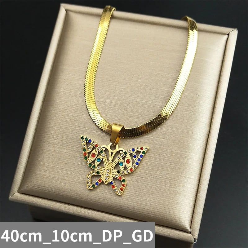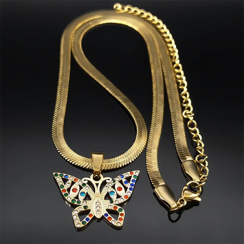 蝶 バタフライ 昆虫 インセクト カラフル クリスタル ネックレス ステンレス スチール ビンテージ 鎖骨 チェーン レディース チョーカー ジュエリー NS
