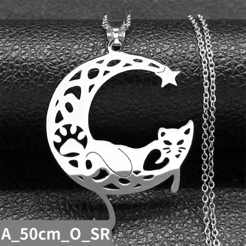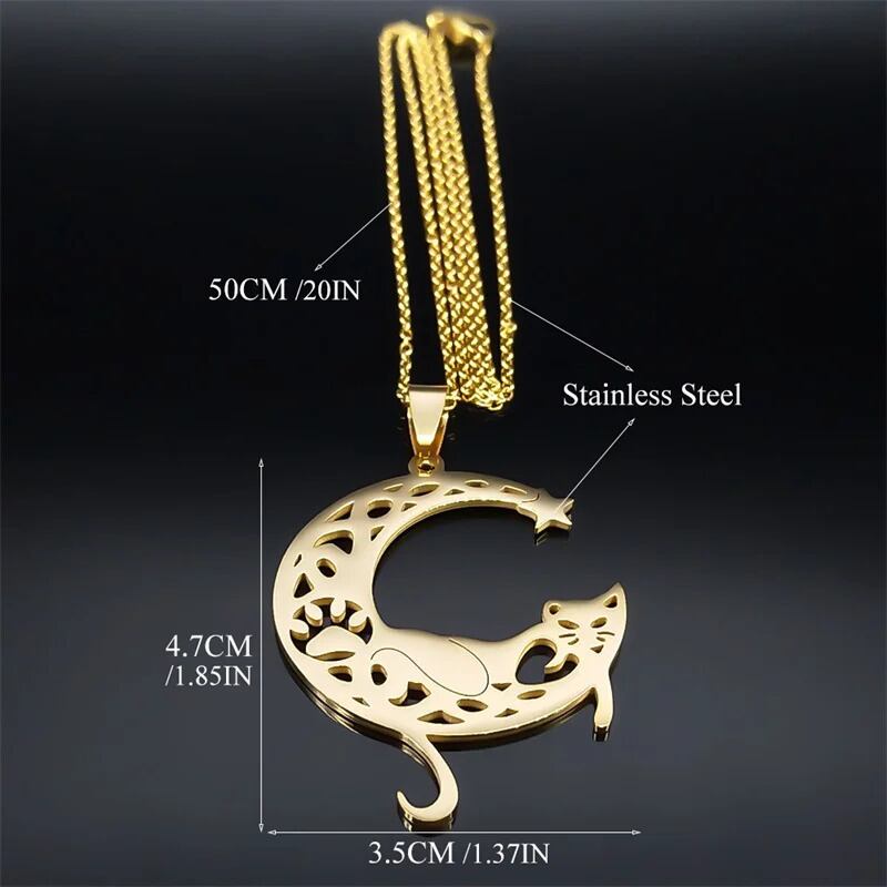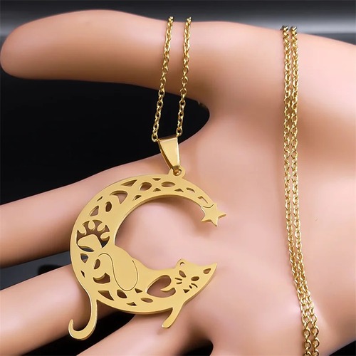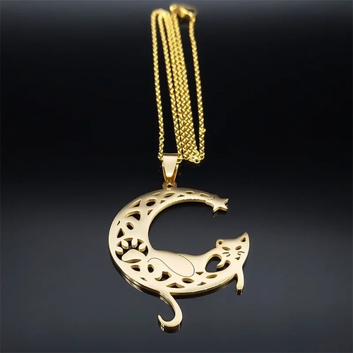 月 ムーン シェイプ 猫 ネコ キャット 動物 アニマル ネックレス レディース 魔女 ウィッチ 結び目 リボン ペンダント ステンレス スチール ゴールド カラー 三日月 ジュエリー N8079S
