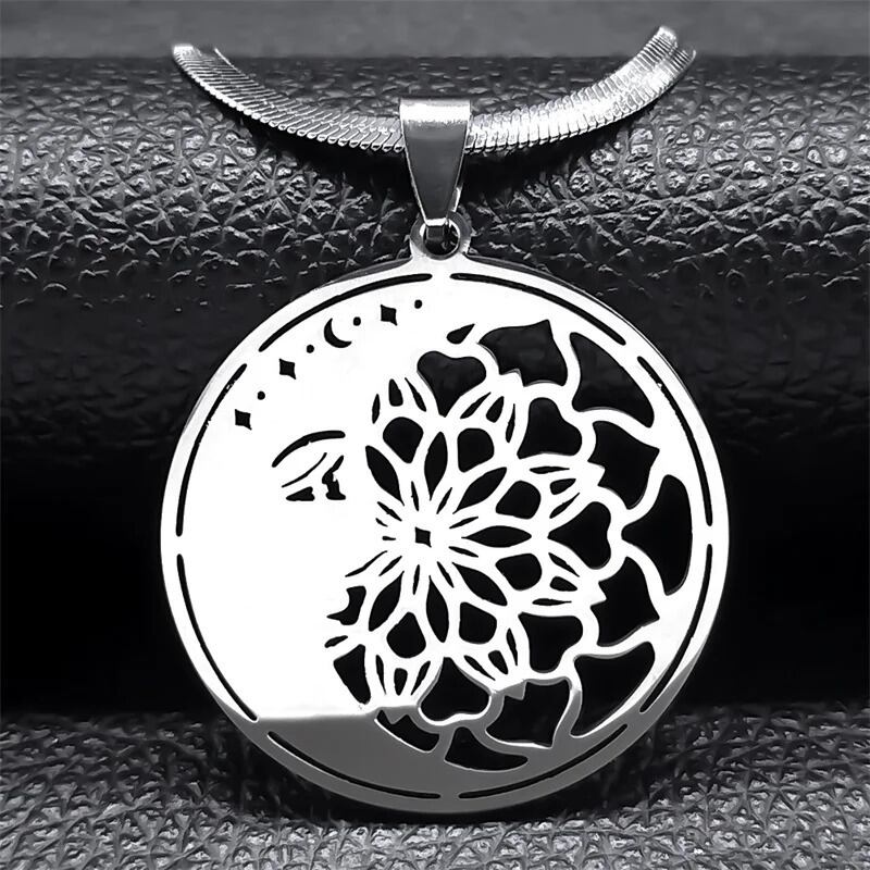 三日月 月 ムーン 花 フラワー マンダラ ネックレス レディース シルバー カラー ステンレス スチール 神聖 ジオメトリ ペンダント ジュエリー N9732S