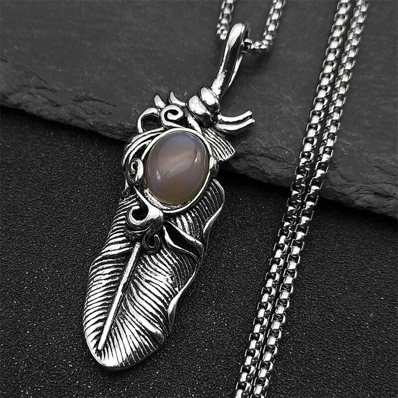 ビンテージ フェザー 羽根 オパール アロイ ペンダント ネックレス レディース メンズ ステンレス スチール チェーン シルバー カラー お守り ナチュラル ストーン ジュエリー