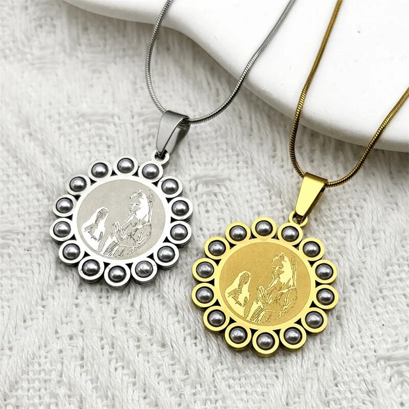 宗教的 バージン メアリー ステンレス スチール イミテーション パール ペンダント ネックレス レディース メンズ ゴールド カラー キリスト チョーカー ジュエリー