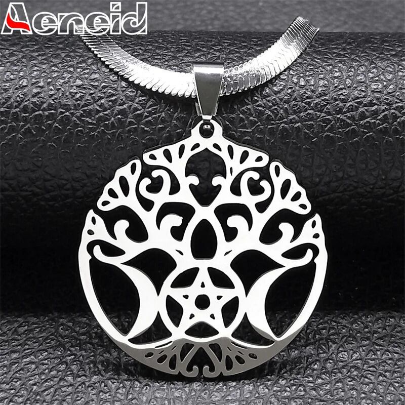 木 ツリー 木の葉 リーフ 植物 プラント ライフ トリプル 月 ムーン 五芒星 スター ネックレス レディース ステンレス スチール シルバー カラー チョーカー ジュエリー N
