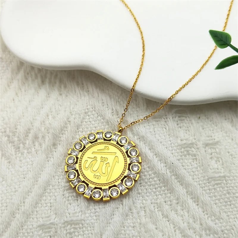 イスラム アラブ アラー ゴッド スクリプチャー 白 ホワイト ジルコン ジルコニア メダル ペンダント ネックレス ステンレス スチール レディース メンズ ゴールド カラー パーティ ジュエリー ギフト