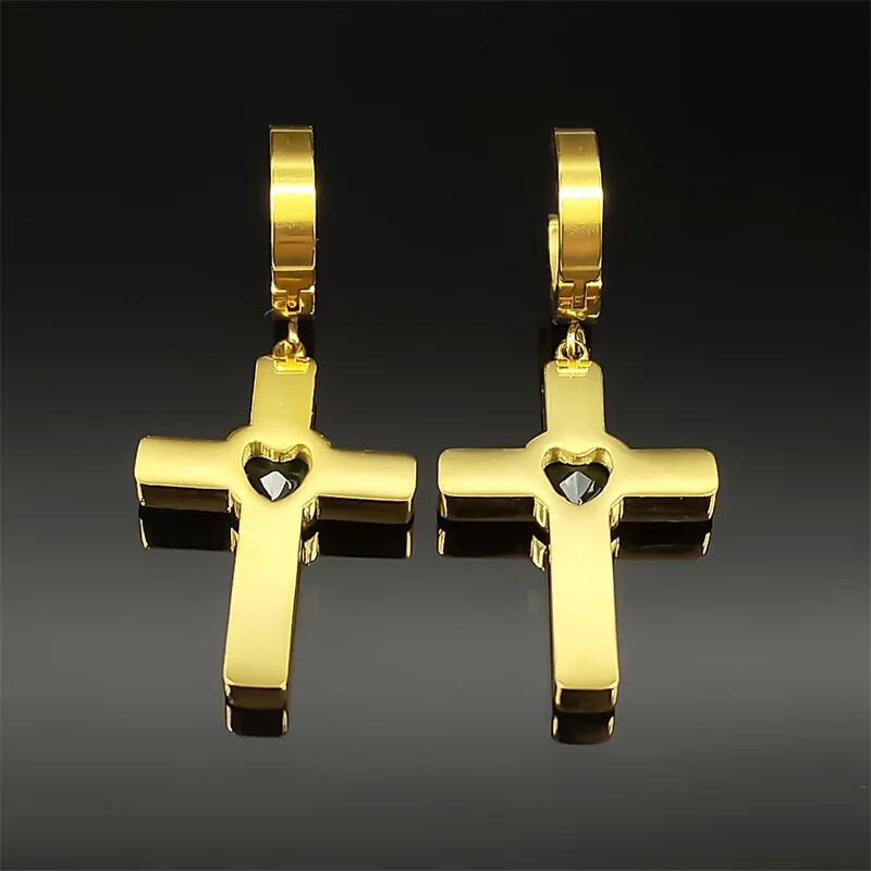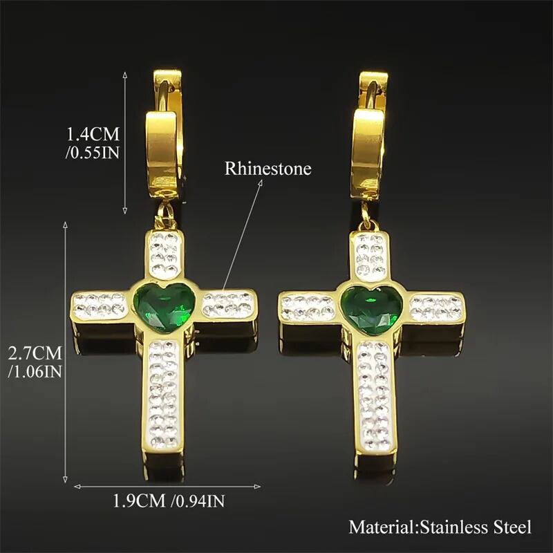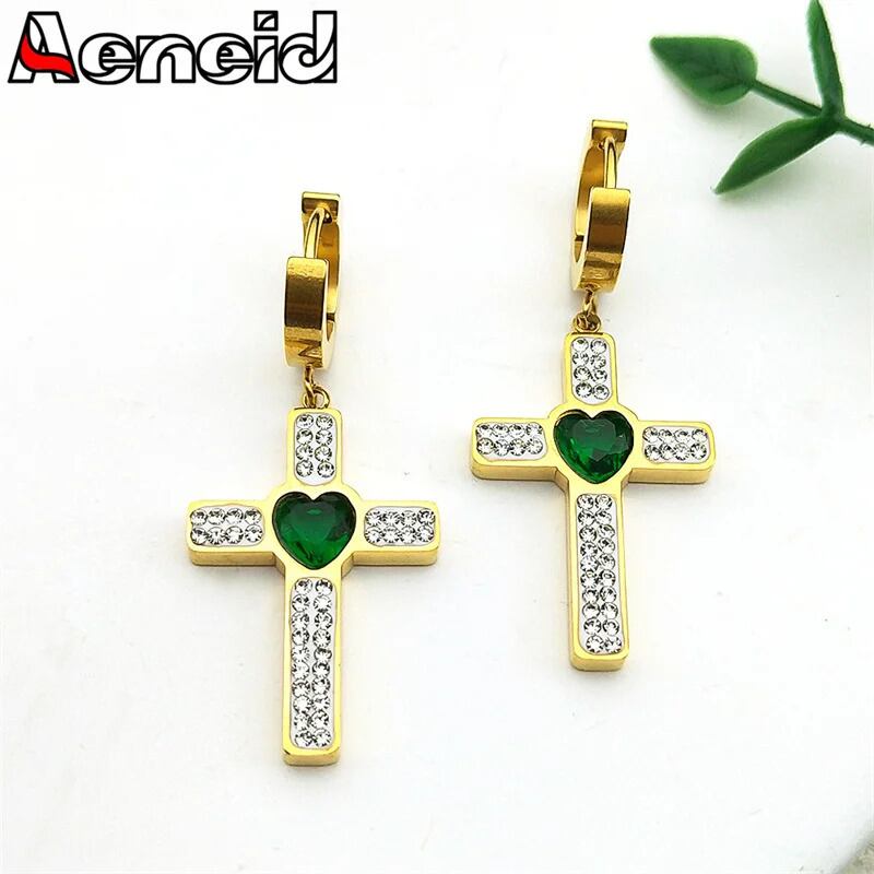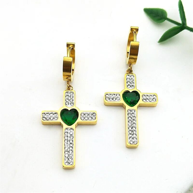 チャーム クロス 緑 グリーン Love ハート ラインストーン ピアス レディース ガール ステンレス スチール ゴールド カラー パーティ ドロップ ジュエリー ギフト
