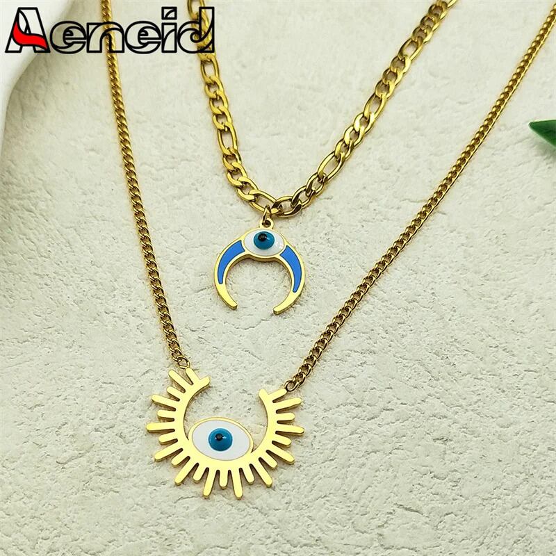 ステンレス スチール 二重層 悪 エビル 青 ブルー 目 アイズ 月 ムーン 太陽 ネックレス レディース メンズ ゴールド カラー セーター チェーン お守り ジュエリー ギフト