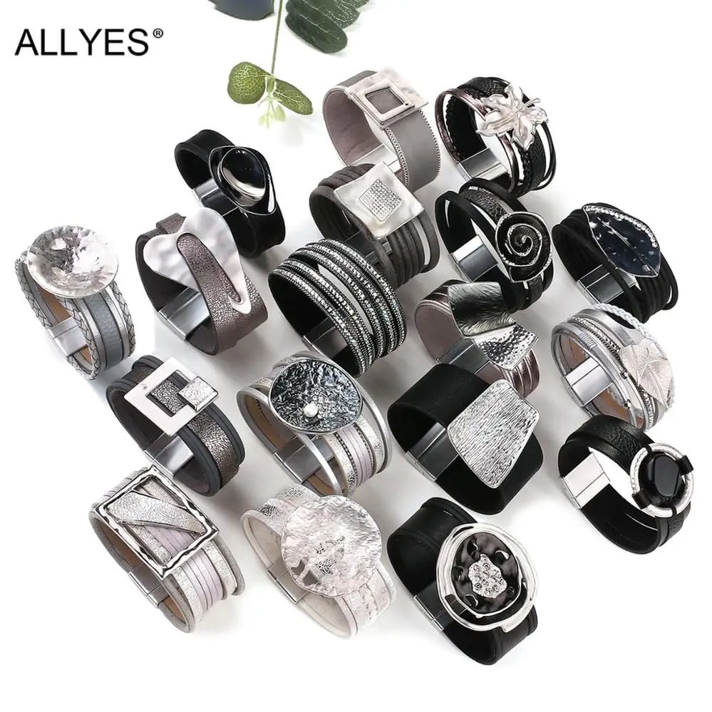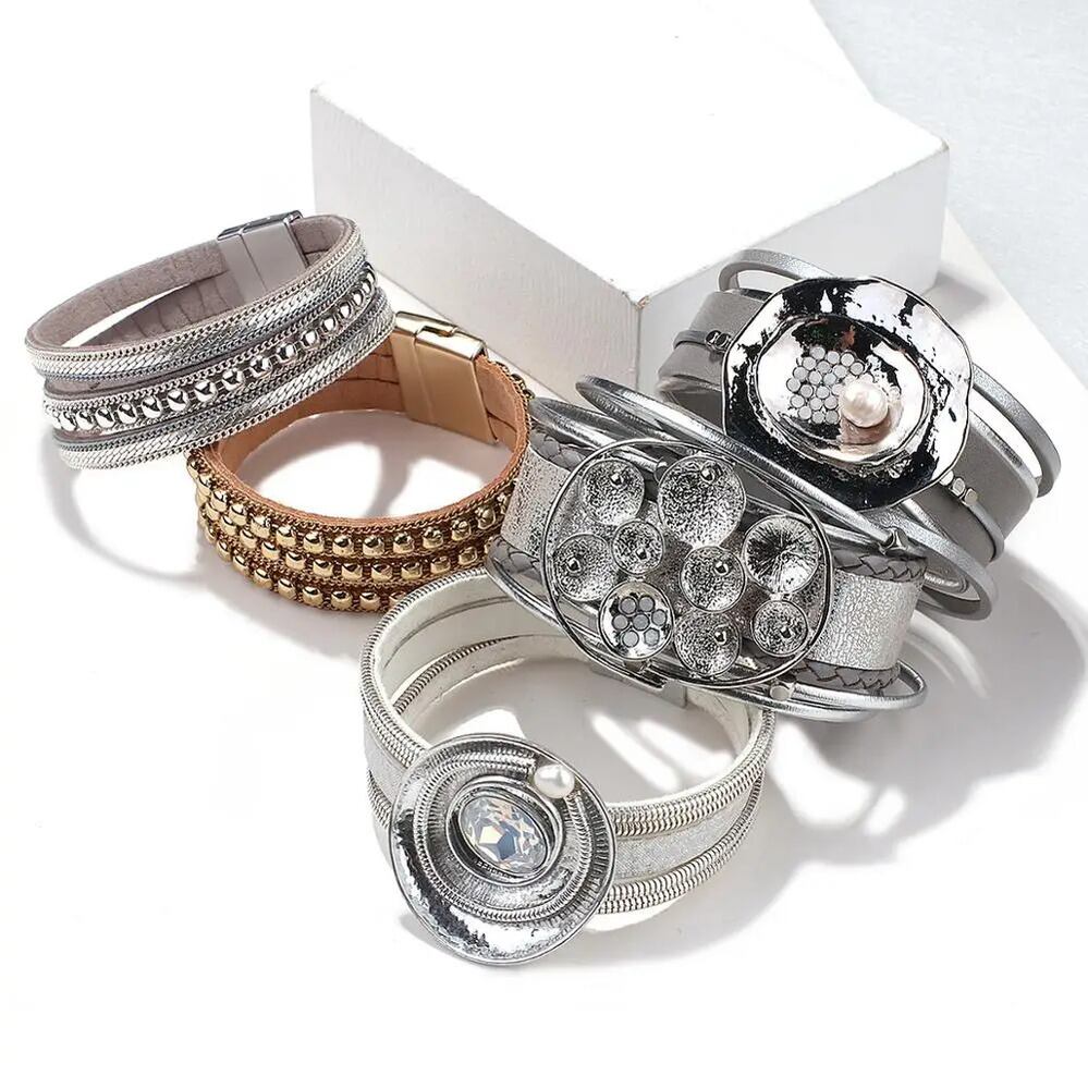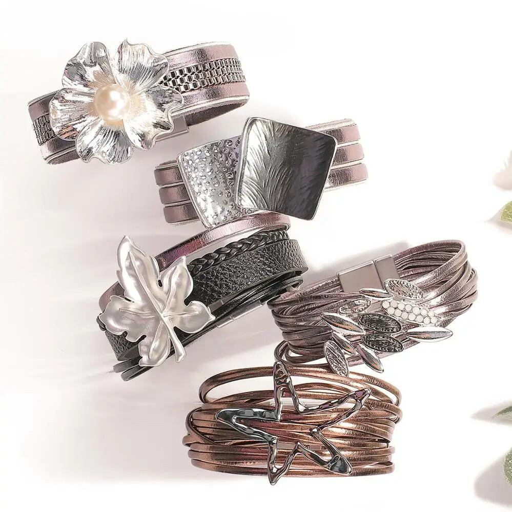 クリスタル パール エナメル メタル 幾何学 木の葉 リーフ チャーム ブレスレット レディース メンズ 多層 マルチレイヤー レザー 幅 ラップ パーティ ジュエリー