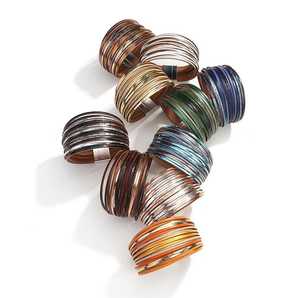 BOHO 細い ストリップ 多層 マルチレイヤー レザー ブレスレット レディース メンズ ファッション マルチカラー シュレッド ラップ シンプル ユニセックス ジュエリー